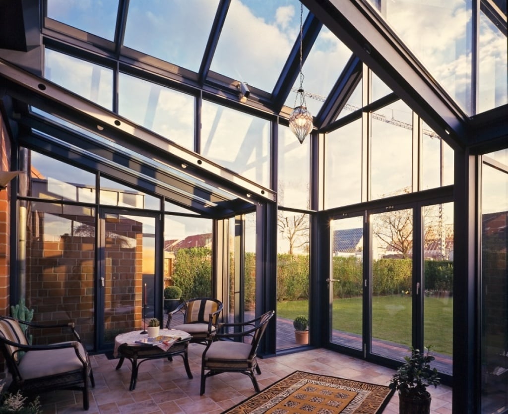 Кроме того, из алюминиевого профиля изготавливают каркас, на котором закрепляют остекление зимних садов, крыш и козырьков. Оно пропускает много света, создавая комфортные условия для растений. По такой же технологии можно отгородить любое жилое помещение, создав в нем нужный температурный режим.