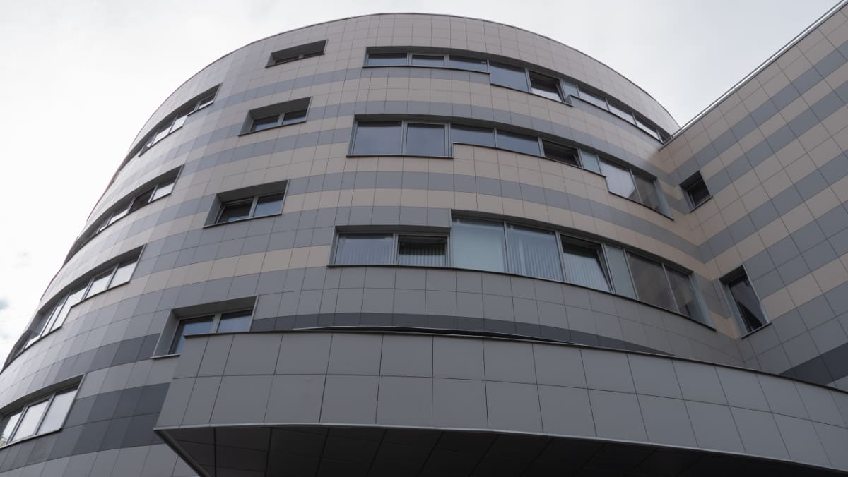 Недорогой фасадный керамогранит — моноколор, без фактурного рисунка. Особенно востребован материал светлых оттенков (белый, серый, бежевый) стандартных размеров 600х600, 1200х600 мм. Если выбирать плиты меньших размеров, то увеличится расход металлоконструкций. Большой формат стоит дороже, его обычно поставляют из-за рубежа.