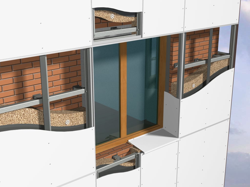 Крепить подоблицовочную конструкцию можно как на несущие, так и на самонесущие стены из разных материалов (кирпич, бетон и другие). Обычно она представляет собой металлический каркас из профилей разного сечения. Тип профилей выбирается с учетом общего веса готового фасада.