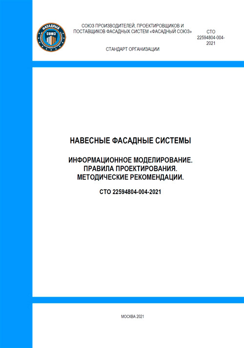 Специалистами Фасадного Союза подготовлен Стандарт СТО 22594804-004-2021 «Информационное моделирование. Правила проектирования. Методические рекомендации», в котором изложен опыт, приобретенный в процессе разработки проектов на фасады и работы с регламентными документами (СП, ГОСТ), а также с BIM-стандартами организаций.